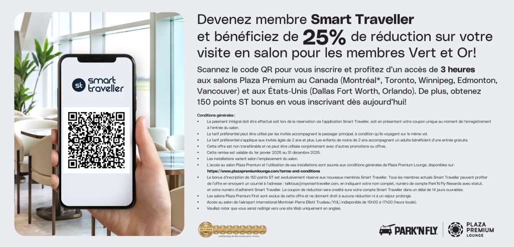 Plaza Premium – Scannez le code QR pour vous inscrire et profiter d’un accès de 3 heures aux salons Plaza Premium au Canada (Montréal, Toronto, Vancouver, Edmonton, Winnipeg).